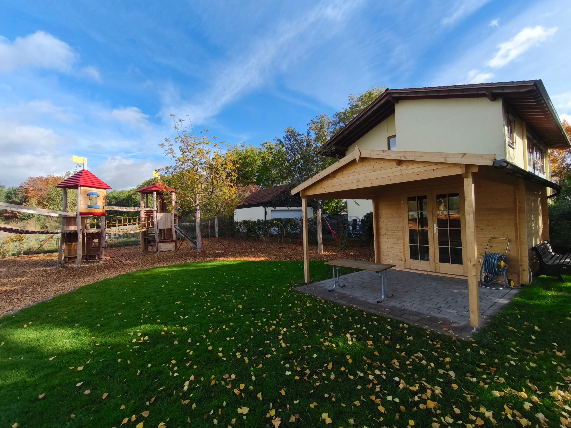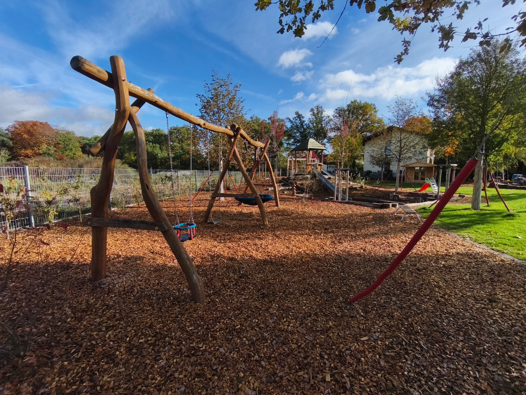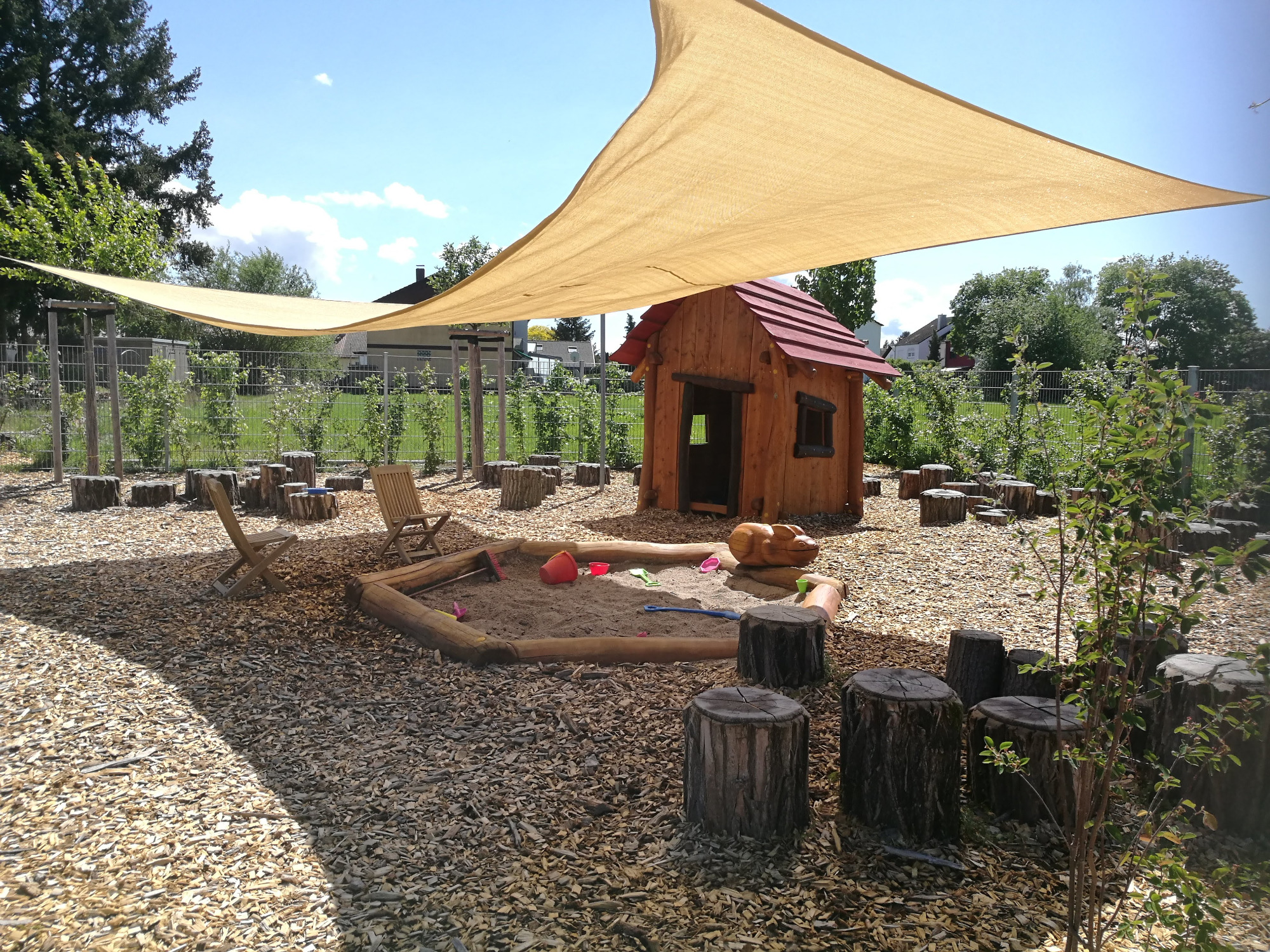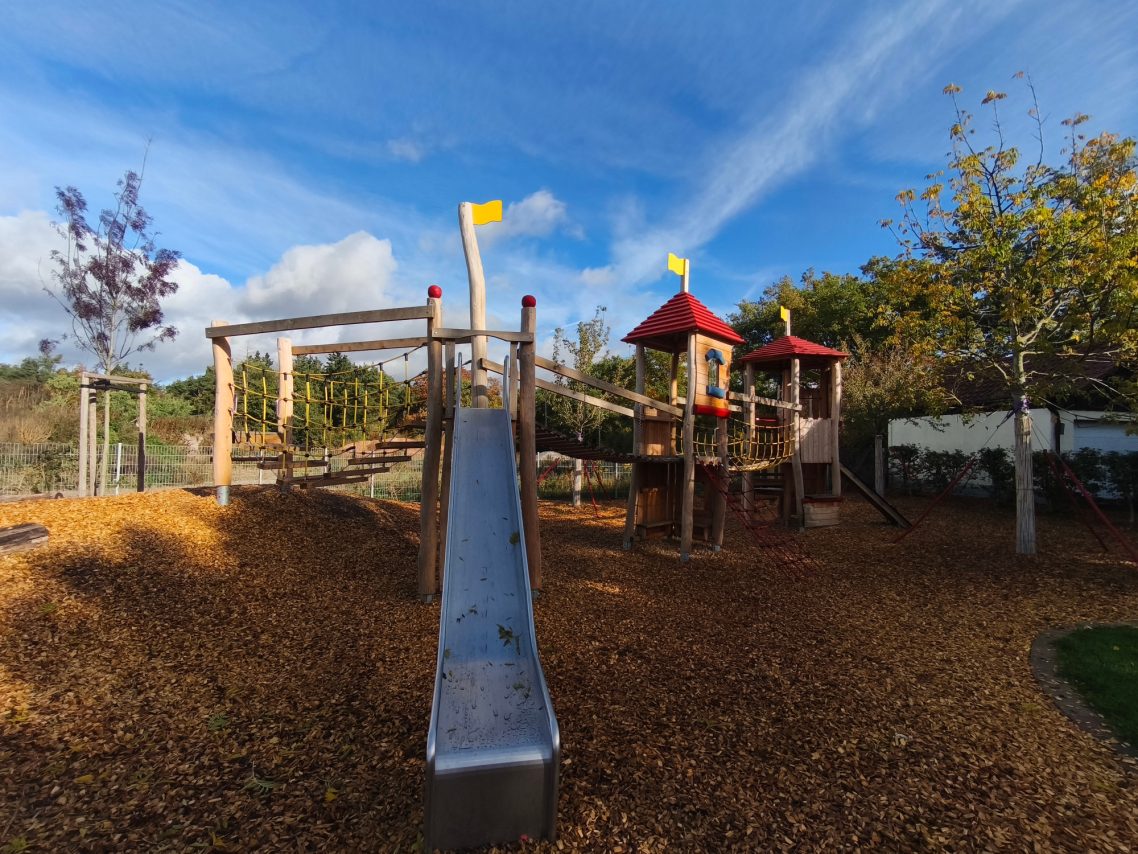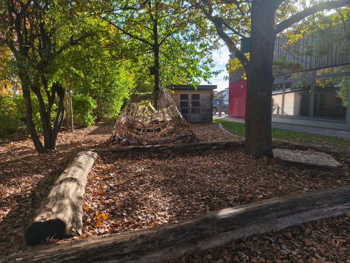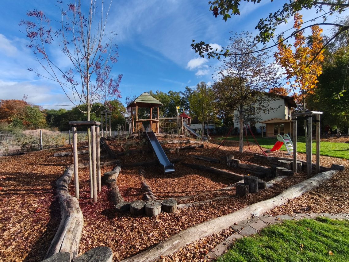Unser großzügiges, naturnahes Außengelände verfügt über großzügige Rasenflächen, Matschplatz, Sandkästen, gepflasterten Wegen, auf welchem die Kinder mit verschiedenen Fahrzeugen fahren könne und über vielfältige Spielmöglichkeiten und -geräte.