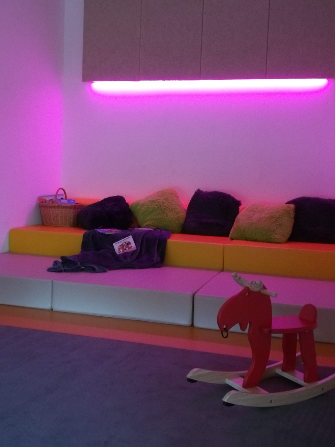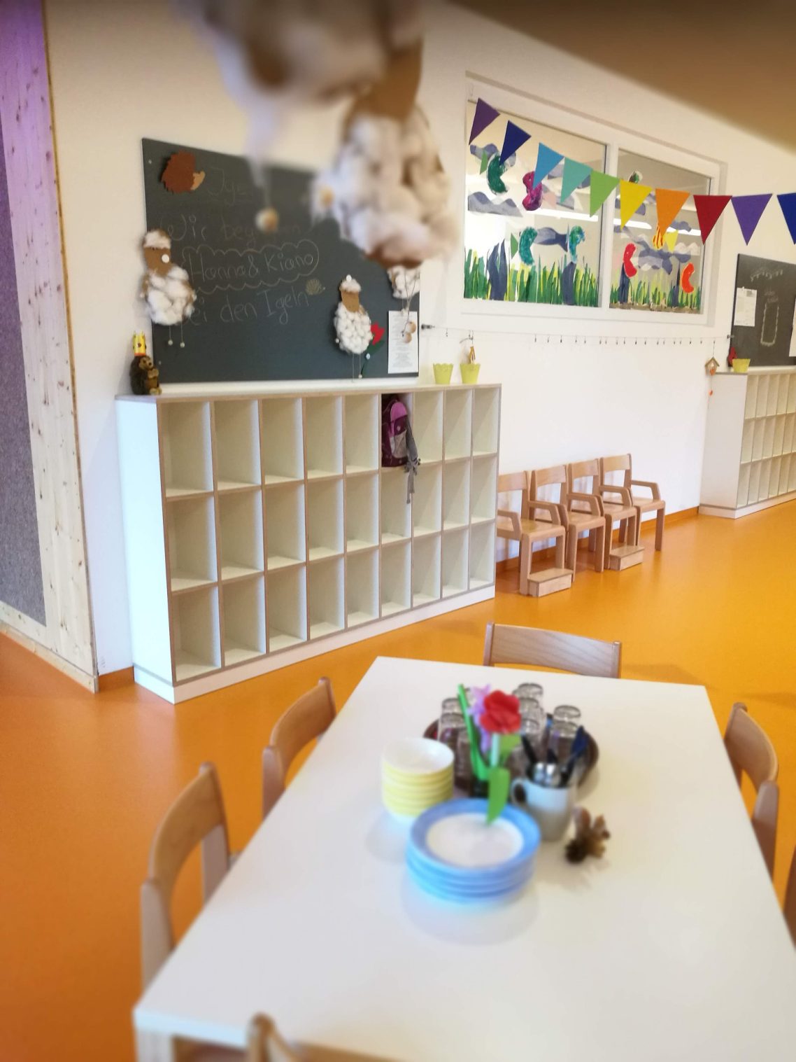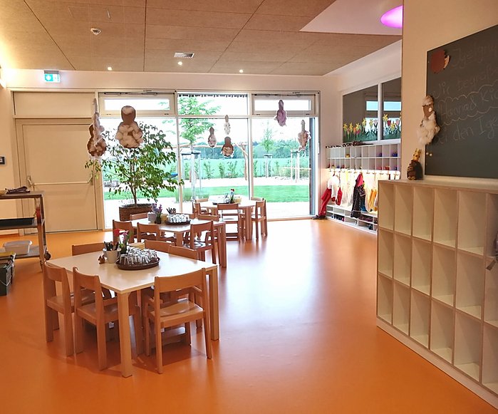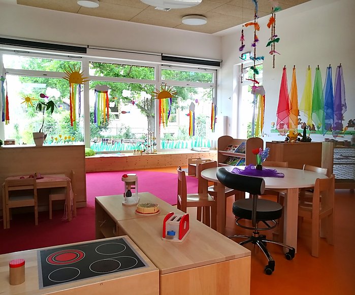 Unsere hellen lichtdurchfluteten Räume und der breite Flur laden die Kinder zum Spielen und Erkunden ein. Die beiden Gruppenräume verfügen über eine Bau- und Konstruktionsecke, einem Rollenspielbereich und einer Kreativecke. Der großzügige Teppich lädt zum Puzzeln, konstruieren und verweilen ein, die kuschligen Höhlen bieten einen Rückzugsbereich zum kuscheln und Bilderbuchbetrachtung.